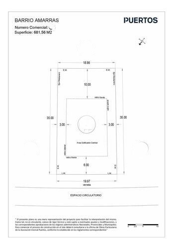 Hermoso lote interno en Amarras puertos del lago. Medidas 682 total. frente 19.97, fondo 18.98 Largo 35 metros. El Barrio Amarras cuenta con salida al lago central y muelle comunitario con bajada náutica, club house con pileta, canchas de tenis y SUM. Además, se encuentra estratégicamente ubicado con rápido acceso a R25 y zona comercial. Puertos del Lago es un reconocido desarrollo inmobiliario que destaca por su entorno natural, amplias áreas verdes y hermosas lagunas, brindando un ambiente sereno y relajante para aquellos en busca de un lugar único para establecerse. Con un acceso directo desde la Panamericana y ubicado en medio de un entorno verde, esta ciudad ofrece un plan integral sólido y una propuesta urbanística que combina el valor artístico, paisajístico y ambiental de manera excepcional. En Puertos del Lago encontrarás la combinación perfecta entre tranquilidad y contacto directo con la naturaleza, sin renunciar a las comodidades de la ciudad. El lugar cuenta con un sistema integral de seguridad que proporciona tranquilidad a sus residentes. Además, ofrece programas de arte y cultura, educación de calidad, unidades de cuidados intensivos disponibles las 24 horas y una proveeduría ubicada en la Plaza Central con productos para las necesidades diarias. Explora la reserva ecológica, practica deportes acuáticos en la playa o participa en disciplinas como básquet, fútbol sobre césped, tenis, gimnasio y natación en el Club Deportivo. Puertos del Lago te brinda un estilo de vida equilibrado que combina el contacto con la naturaleza y las comodidades modernas. Único barrio en el mundo con una sede del Museo Malba! Contáctanos hoy mismo para obtener más información y dar el primer paso hacia la realización de tus sueños. ¡Puertos del Lago te espera con las puertas abiertas para que construyas tu futuro! "Las medidas, superficies y descripciones son al sólo efecto orientativo. No poseen valor contractual" La publicación de este inmueble es a solo título informativo, pues la venta de la propiedad está supeditada a que el propietario cumplimente el trámite ante la AFIP para la obtención del Numero de COTI correspondiente. Cod Prop: Martin Todres Propiedades Mat. CMZC 620 Cód. del anunciante: 30622909 Cód. Zonaprop: TOD251 Número de matrícula: 620 Publicado en Zonaprop por Martin Todres Propiedades